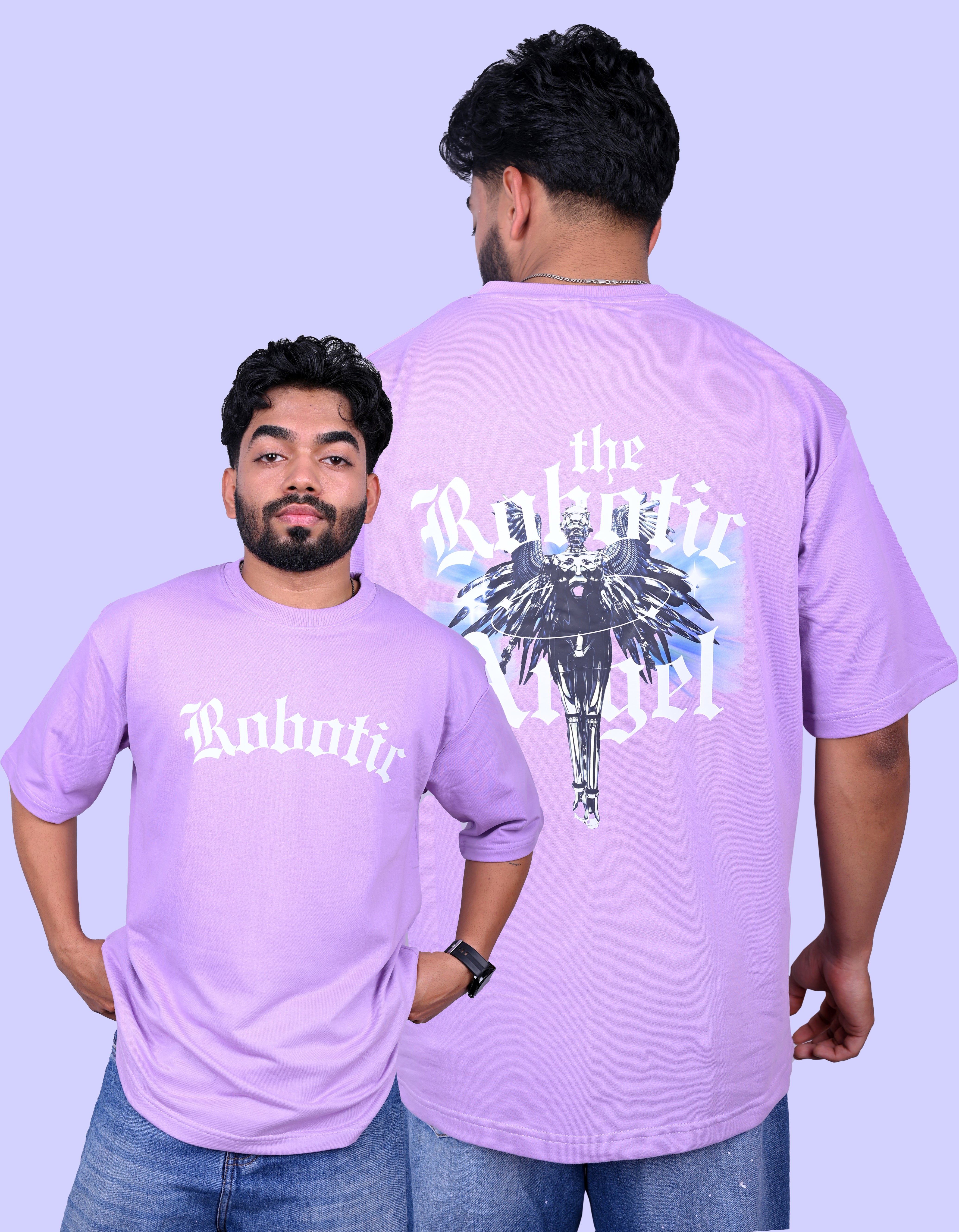 Step into the future of streetwear with this lavender oversized t-shirt, crafted from premium 240 GSM French Terry for heavyweight comfort and all-day wear. The front carries a bold "Robotic" print in gothic typography, while the back showcases a striking "Robotic Angel" artwork, blending futuristic mech aesthetics with angelic power. Designed for an oversized fit, this tee offers a relaxed, on-trend silhouette perfect for layering or wearing solo.